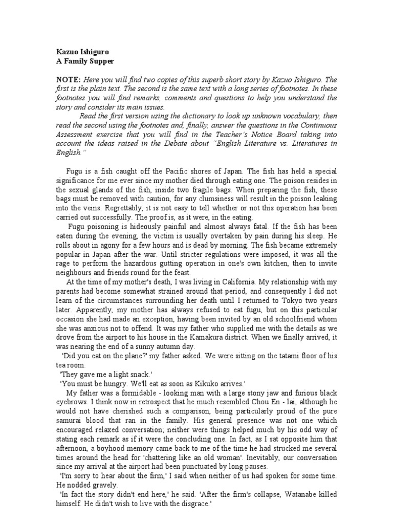 His mother had survived the atomic bomb attack on when he was 15, his family decided to remain in britain permanently. His wife and his two little girls.' 'oh yes?' Kazuo ishiguro's 1982 short story a family supper tells the story of a japanese family, sitting down to dinner together for the first time in years. His family left japan in 1960 and immigrated to england, where he attended the universities of kent (b.a., 1978) and east anglia 2 (m.a., 1980). Kazuo ishiguro tells us of an exceedingly powerful story.